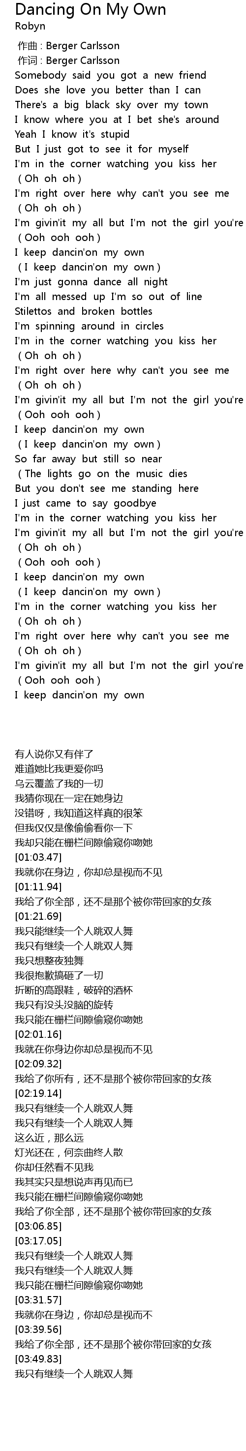 Robyn - Dancing On My Own (Lyrics) "I'm in the corner watching you kiss her", Follow 7clouds on Spotify : http://bit.ly/7CLOUDS Robyn - Dancing On My Own (Lyrics) ⏬ Download / Stream: . We Have got 7 picture about Dancing On My Own Lyrics images, photos, pictures, backgrounds, and more. In such page, we additionally have number of images out there. Such as png, jpg, animated gifs, pic art, symbol, blackandwhite, pics, etc. "Calum Scott - Dancing On My Own (Official Video)", Calum's debut album 'Only Human' feat. "You Are The Reason" & "Dancing On My Own" out now! iTunes: . "Calum Scott Becomes Simon Cowell's Golden Boy! , Calum Scott Becomes Simon Cowell's Golden Boy! | Britain's Got Talent...